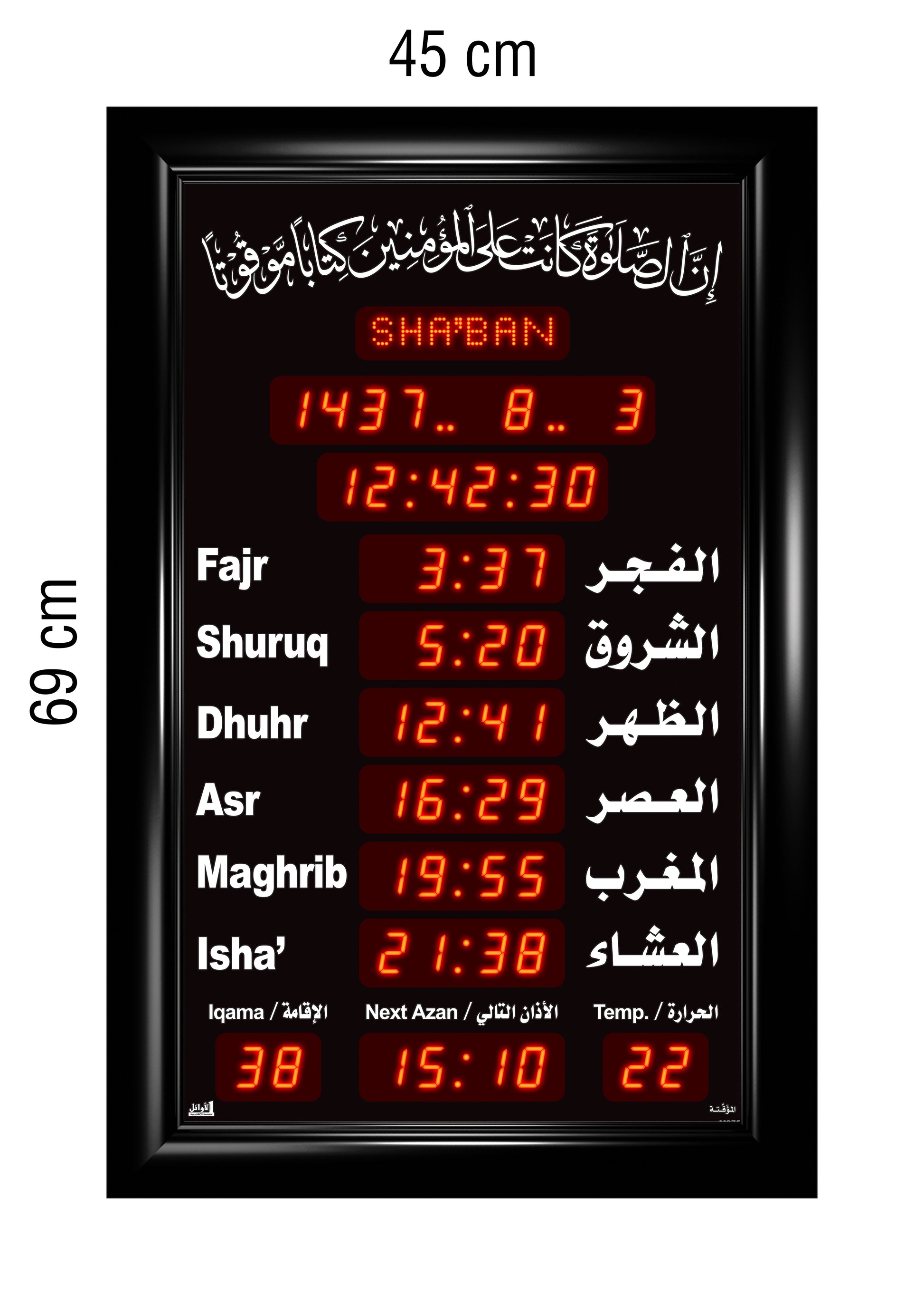 Displaying Azan timings and IQAMA (JAMAAT) timings in two different colored columns.